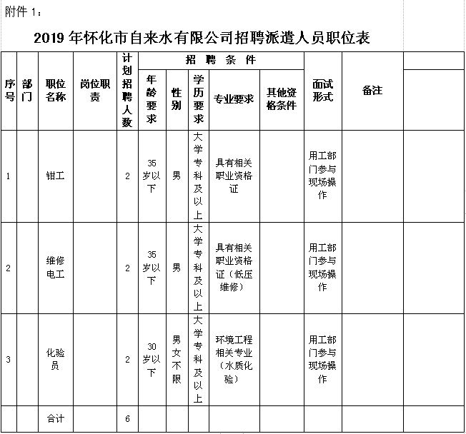 本次公開招聘職位共 3個,招聘人數(shù)共6名。具體職位、人數(shù)及資格條件詳見附件1《2019年懷化市自來水有限公司招聘派遣人員職位表》。