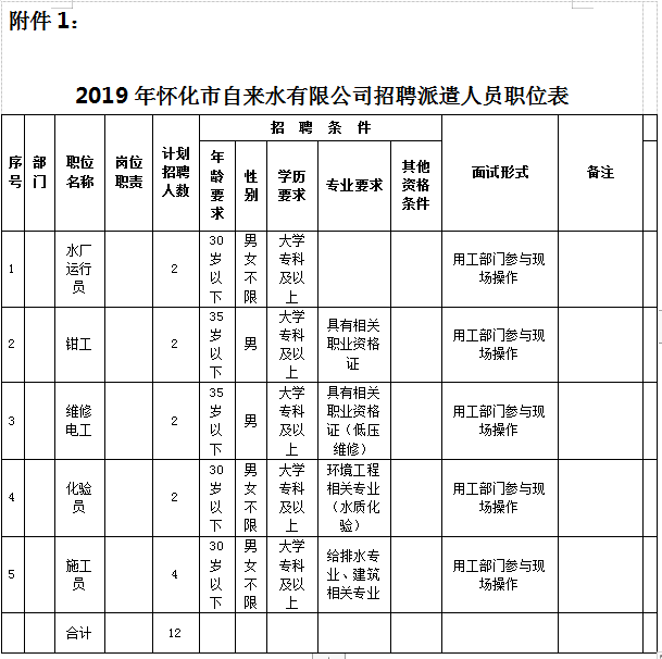 本次公開招聘職位共 5個,招聘人數(shù)共12名。具體職位、人數(shù)及資格條件詳見附件1《2019年懷化市自來水有限公司招聘派遣人員職位表》。