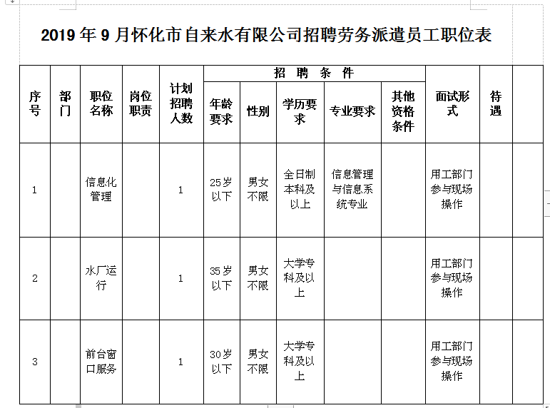 受懷化市自來水有限公司委托,我公司現(xiàn)面向社會公開招聘3名工作人員,具體招聘信息如下: