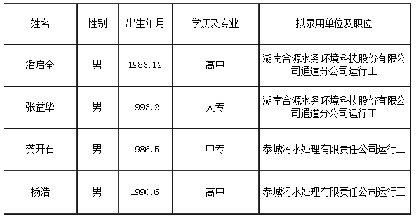 經筆試、面試、體檢等程序,擬錄用潘啟全、張益華為湖南合源水務環(huán)境科技股份有限公司通道分公司運行工,龔開石、楊浩為恭城污水處理有限責任公司運行工現予以公示。公示時間為2019年11月7日—2019年11月9日,如有異議者請向湖南合源水務環(huán)境科技股份有限公司綜合管理部提出,過期不予受理。聯(lián)系電話:0745—2293111