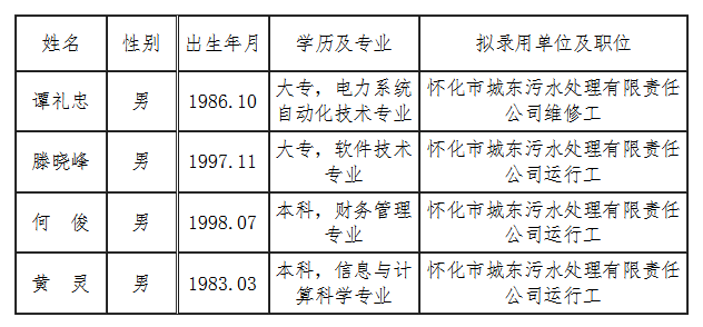 經(jīng)筆試、面試、體檢等程序,擬錄用譚禮忠為懷化市城東污水處理有限責(zé)任公司維修工;滕曉峰為懷化市城東污水處理有限責(zé)任公司運(yùn)行工;何俊為懷化市城東污水處理有限責(zé)任公司運(yùn)行工;黃靈為懷化市城東污水處理有限責(zé)任公司運(yùn)行工現(xiàn)予以公示。公示時(shí)間為2021年4月1日—2021年4月6日,如有異議者請(qǐng)向湖南合源水務(wù)環(huán)境科技股份有限公司綜合管理部提出,過期不予受理。聯(lián)系電話:0745—2293020。