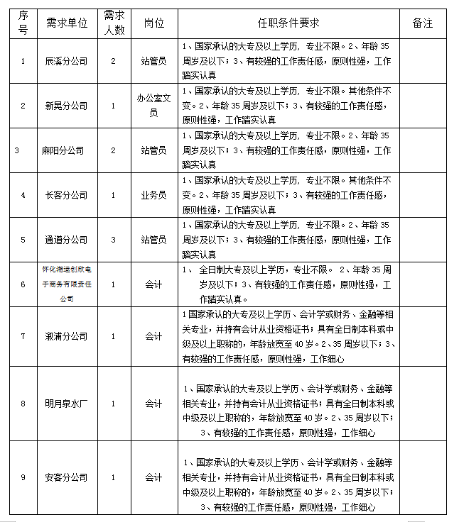 我公司于2023年2月23日至3月6日通過懷化人才網(wǎng)面向社會發(fā)布了招聘信息。經(jīng)第一次延長報名時間后,基層縣市(區(qū))分公司有的崗位仍無人報名,各基層單位又急需補充該崗位工作人員,鑒于這種情況,經(jīng)集團公司研究決定,對以下崗位的招聘要求做以下調(diào)整。