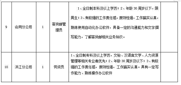 此次共計(jì)劃招聘正式員工10人,招聘崗位、人數(shù)、專業(yè)要求、年齡要求等詳見(jiàn)《 湖南懷化公路運(yùn)輸集團(tuán)有限責(zé)任公司社會(huì)招聘計(jì)劃》。