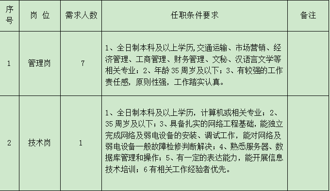 我公司于2023年6月30日至7月30日通過(guò)懷化人才網(wǎng)面向社會(huì)發(fā)布了招聘信息。截止7月30日,以下崗位仍無(wú)人報(bào)名或報(bào)名不足,鑒于這種情況,經(jīng)集團(tuán)公司研究決定,對(duì)以下崗位的招聘延長(zhǎng)報(bào)名時(shí)間,崗位具體要求如下 :