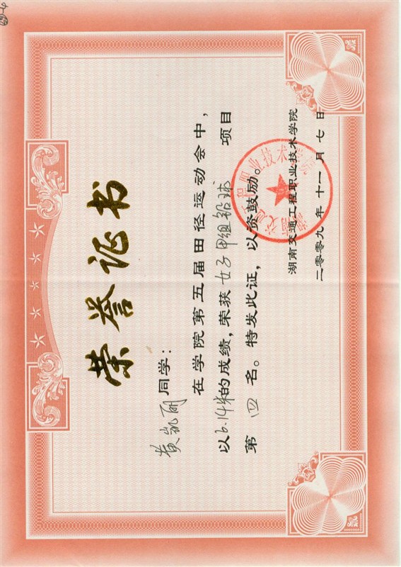 在學(xué)院第五屆運(yùn)動會中,榮獲女子鉛球項(xiàng)目第四名 |