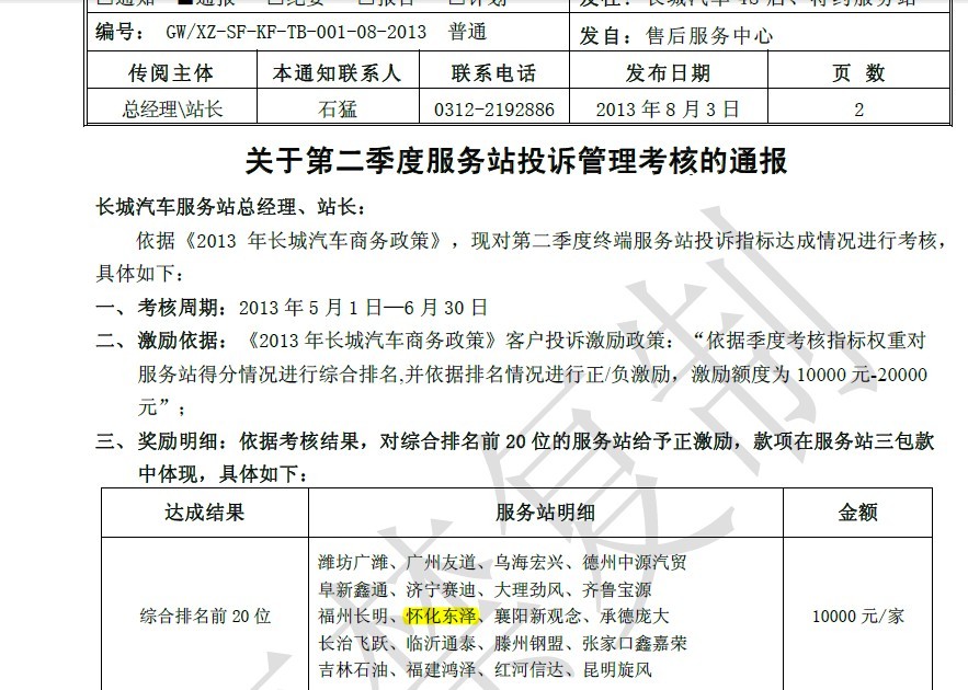 2013年第二季度長城汽車投訴指標(biāo)達(dá)成情況全國排名,我站(懷化東澤)在全國長城汽車投訴指標(biāo)達(dá)成綜合考核中,排名前20名,并正激勵10000元。為年底評分做好鋪墊 |