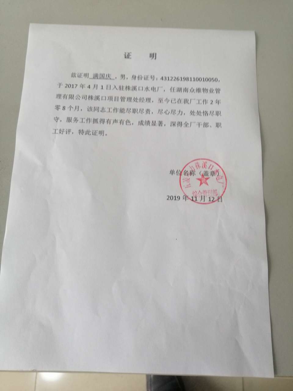 | 戶 口: 湖南省 懷化市 |