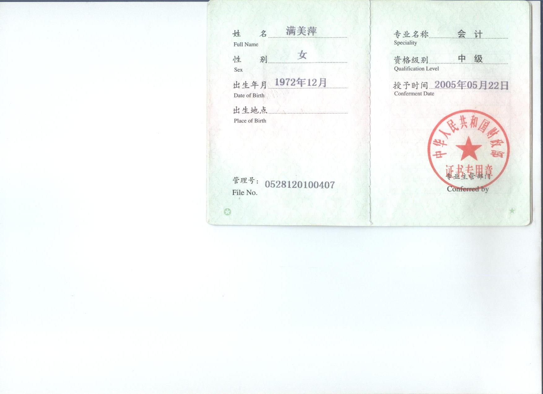 2005年5月參加全國會計中級職稱考試,取得會計師職稱。 |
